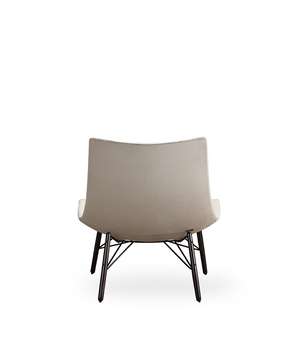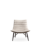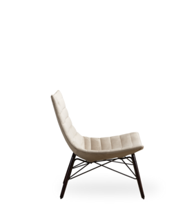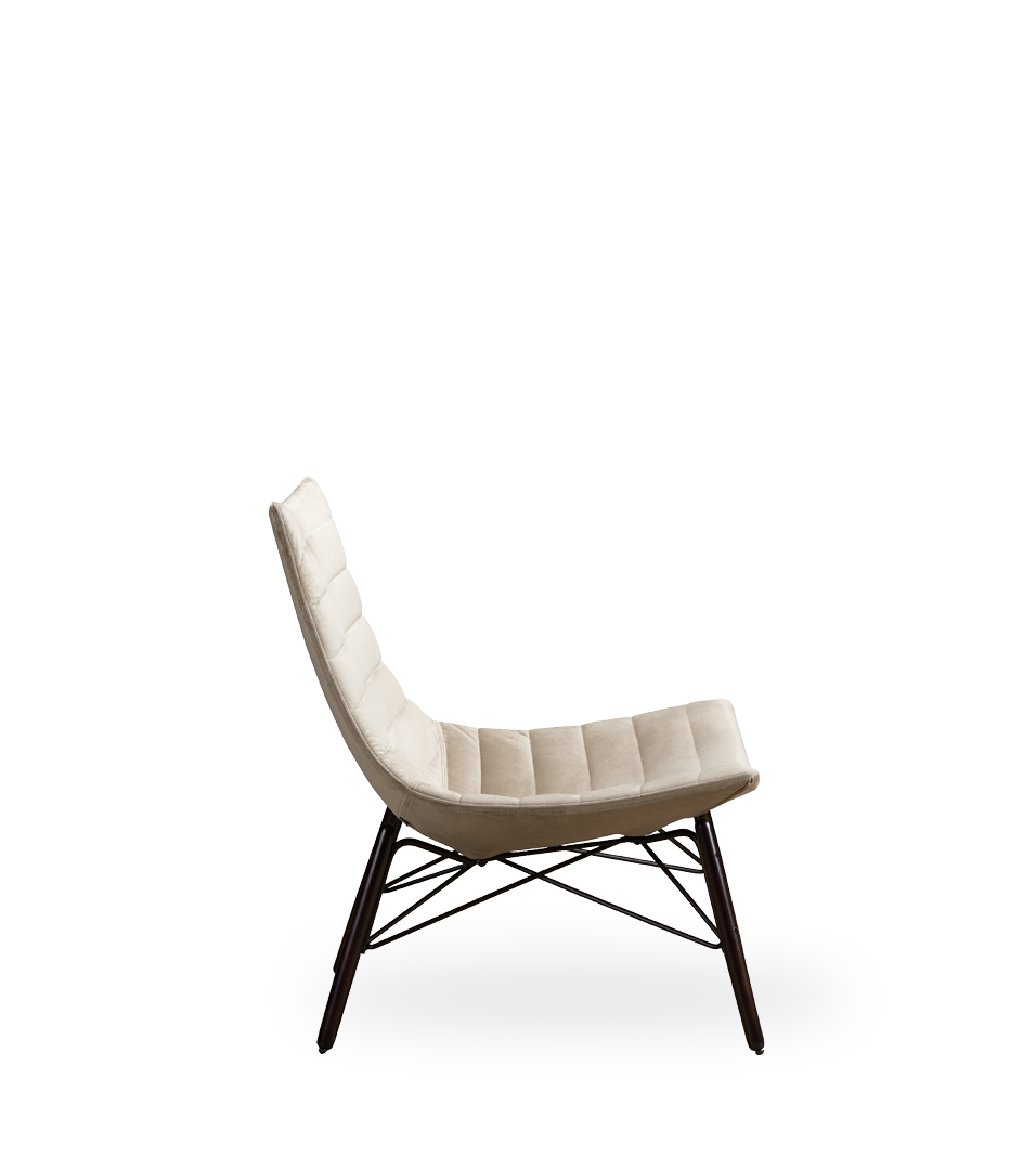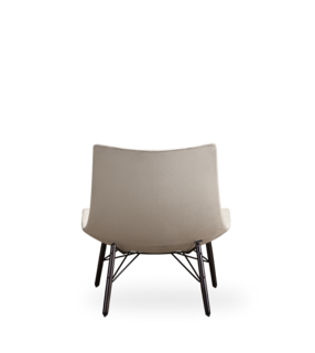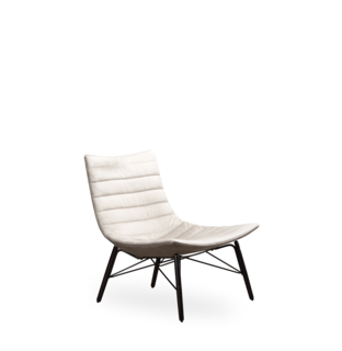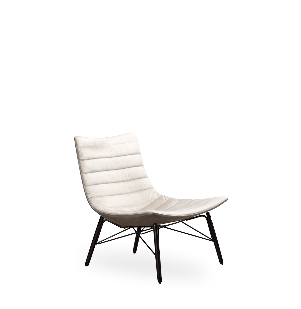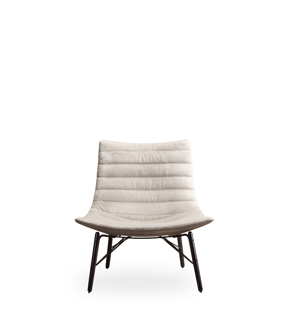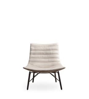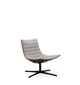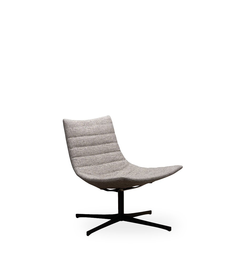 Poltrona lounge in BAYDUR 600 imbottita in poliuretano espanso ignifugo e con rivestimento trapuntato fisso; 2 diversi basamenti: piedi in legno con giunzione e base girevole a croce.