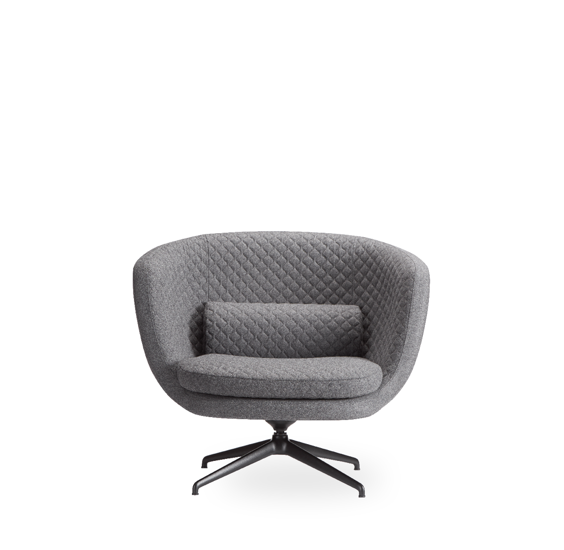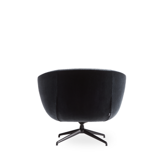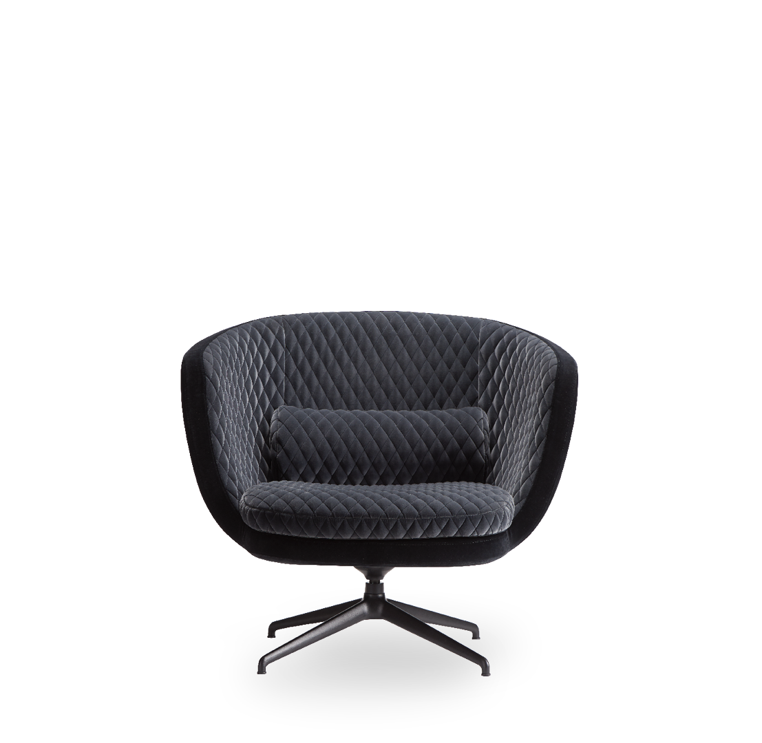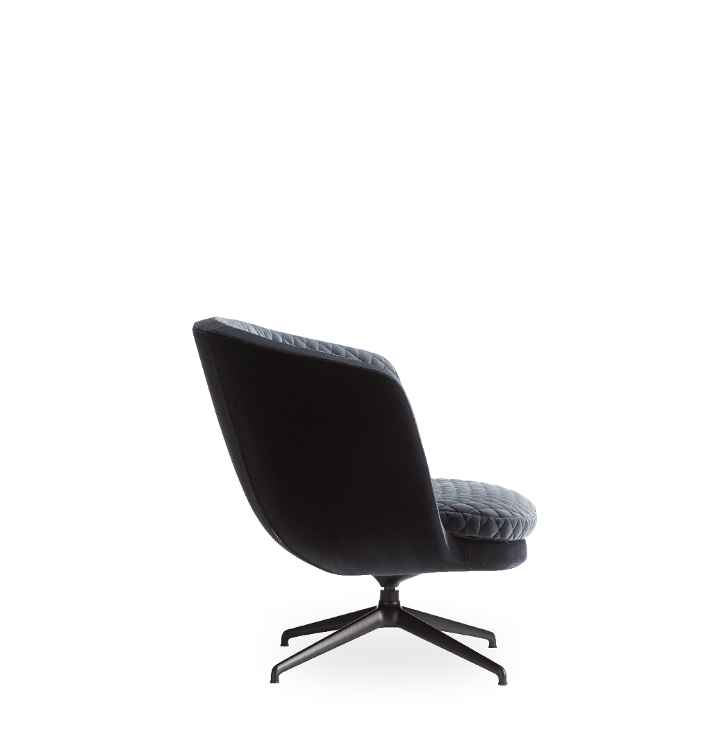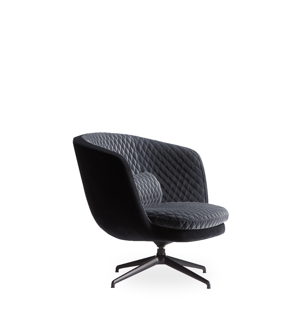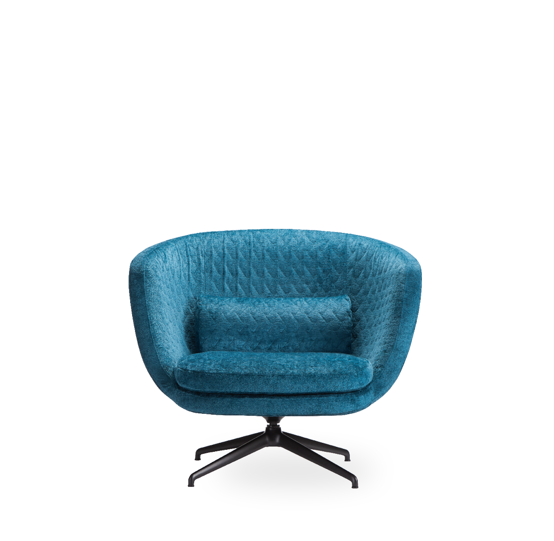 Gestell in POLIMEX® - patentiertes Polymermaterial, tragend, umweltfreundlich, ultraleicht, flammhemmend, aus Polystyrol und Polyurethan; drehbares Gestell in Alu Druckguss schwarz; fixer Bezug verfügbar auch in gesteppten Stoffen; Sitz abziehbar.
