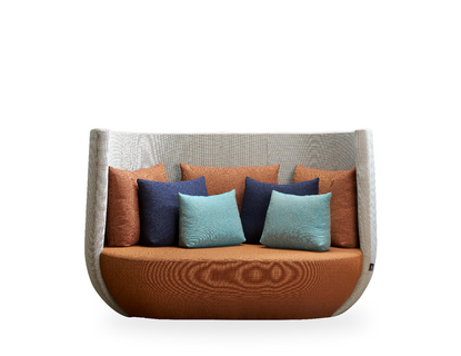 Gestell aus Massiv- und Schichtholz; feuerhemmender Polyurethan-Schaumstoff überzogen mit Wattevlies; Gestell mit fixem Bezug; Sitz und Rücken mit fixem Bezug; 7 lose Rückenkissen (3 x 60 x 45 cm, 2 x 50 x 38 cm, 2 x 40 x 30 cm);