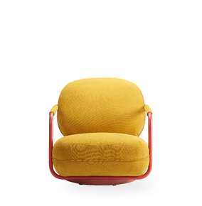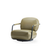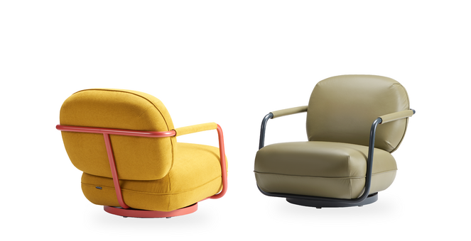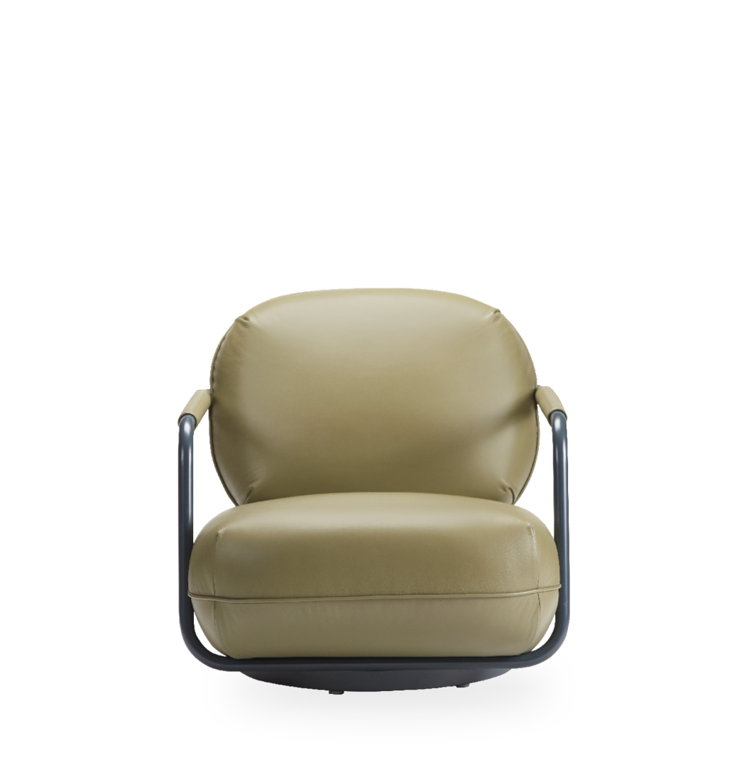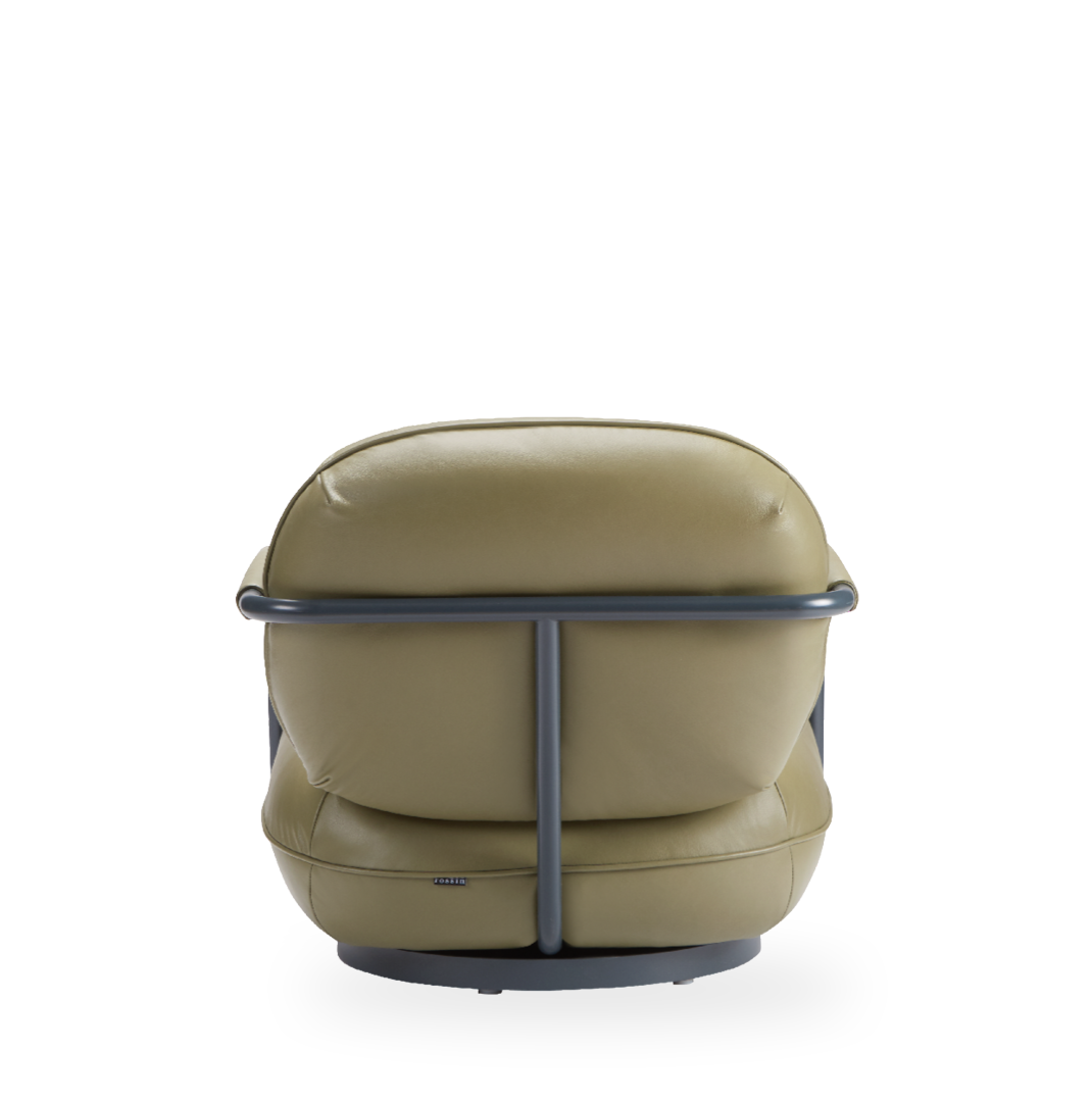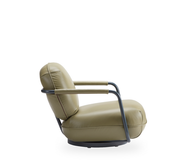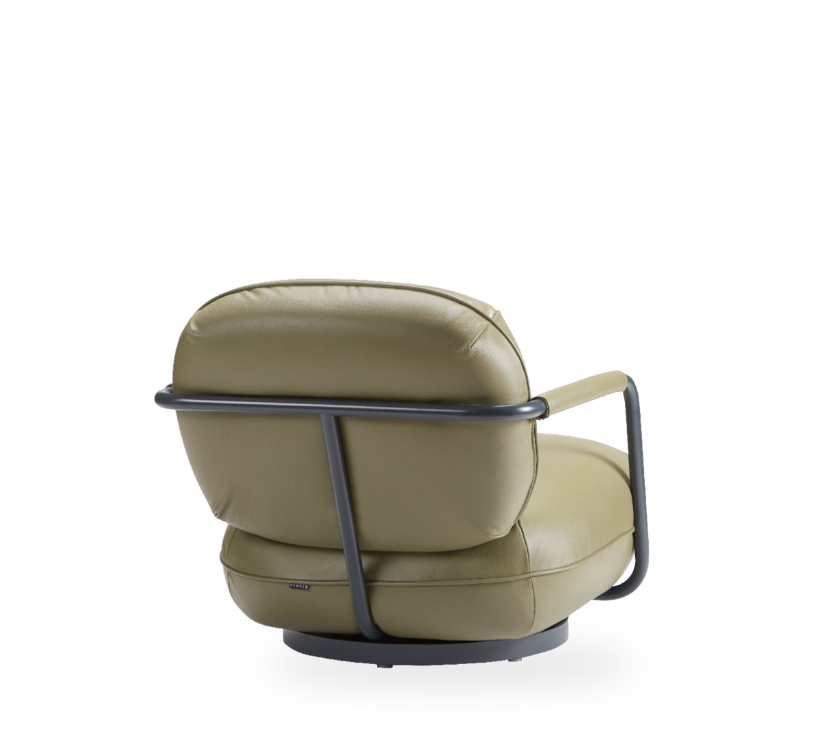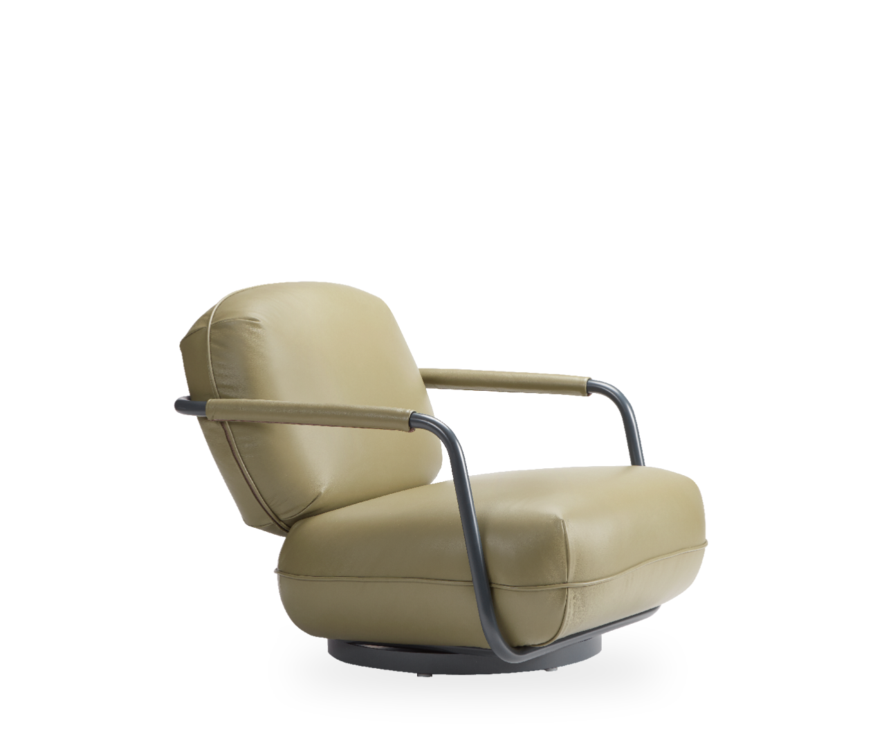 Sitz und Rücken mit Innenleben aus Massiv- und Schichtholz, überzogen mit flammhemmendem Polyurethan-Schaumstoff und Wattevlies; fixer Bezug; drehbares Metall-Rohrgestell lackiert anthrazit.